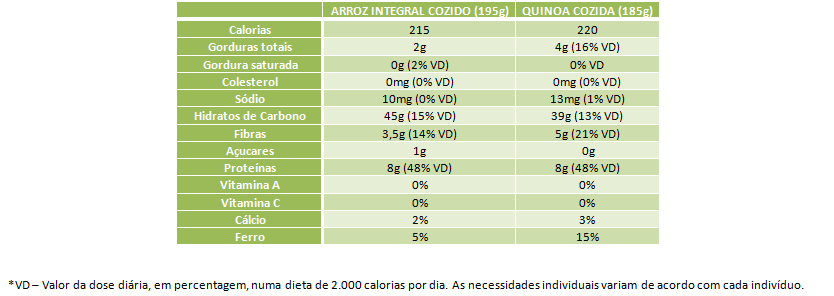 Confira os valores nutricionais da Quinoa e do Arroz Integral: