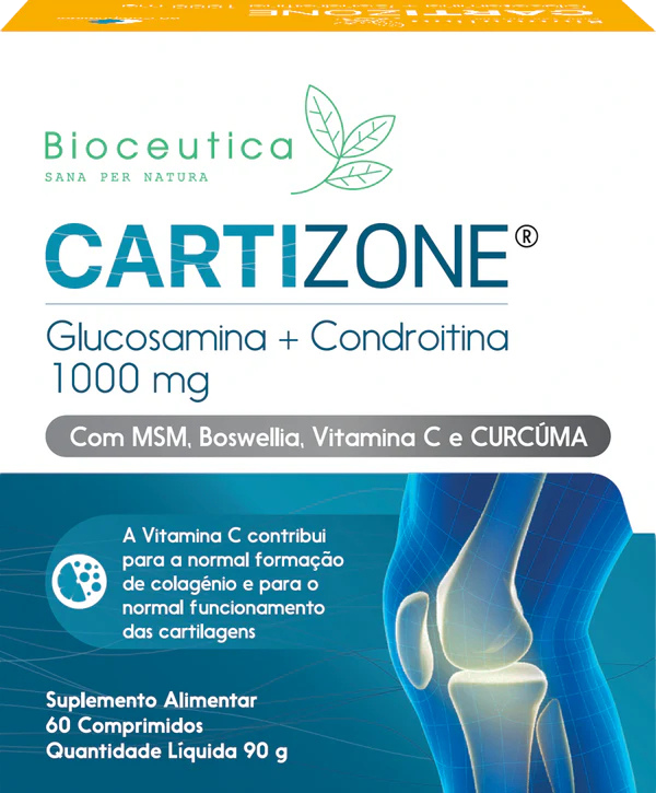 Cartizone Glucosamina + Condroitina é um suplemento alimentar que contém ainda MSM (Metilsulfonilmetano), ingredientes com uma ação sinérgica que contribui para a regeneração das cartilagens, promovendo assim uma maior mobilidade e bem-estar articular. A Curcúma e a Boswellia são plantas com reconhecida ação anti-inflamatória e analgésica que ajudam a aliviar o desconforto associado às crises osteoarticulares. A Vitamina C contribui para a normal formação de colagénio e para o normal funcionamento das cartilagens.