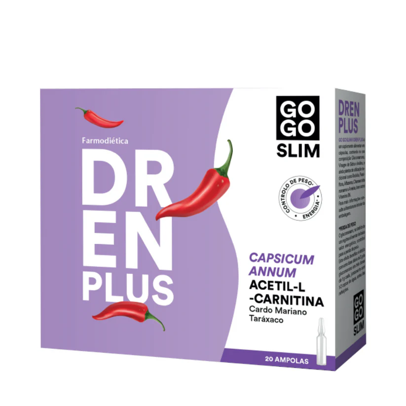 Go Go Slim Dren Plus é um suplemento alimentar em ampolas, cotendo na sua composição Acetil-L-Carnitina, Plantas como Cardo Mariano, Capsicum annuum e Cavalinha, e ainda Vitamina C e Zinco.