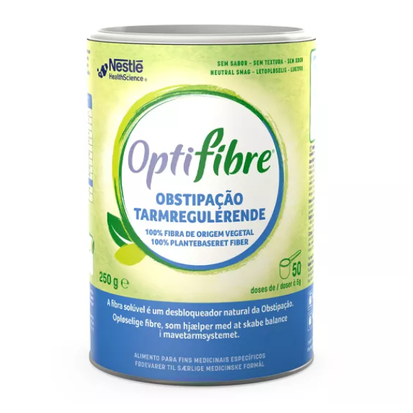É uma fibra 100% solúvel de Goma Guar Parcialmente Hidrolisada (GGPH), de origem 100% de vegetal. É um alimento para fins medicinais específicos, para a gestão nutricional de distúrbios funcionais do cólon, nomeadamente reabsorção/excreção decorrentes de obstipação crónica. OPTIFIBRE contribui para o consumo diário de fibra e atua de forma suave e natural no organismo, apresentando uma boa tolerância. É também apto para grávidas, lactentes e crianças a partir dos 3 anos.