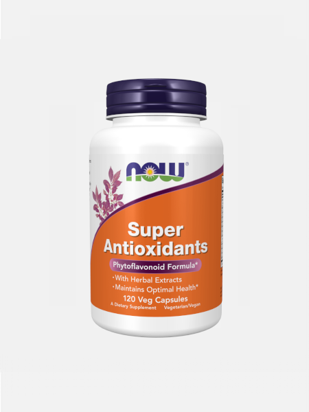 Super Antioxidants da NOW® é uma fórmula que reúne 10 plantas importantes no combate ao stress oxidativo. Por exemplo, o Chá Verde através do seu conteúdo em catequinas, a Curcuma pelos curcuminóides, a Grainha de Uva através dos polifenóis, o Arandovermelho através das proantocianidinas, entre outros. Enzimas como a Bromelaína podem ser muito úteis no combate ao stress oxidativo, inclusive nos processos inflamatórios dos quais resultam muitos radicais livres.